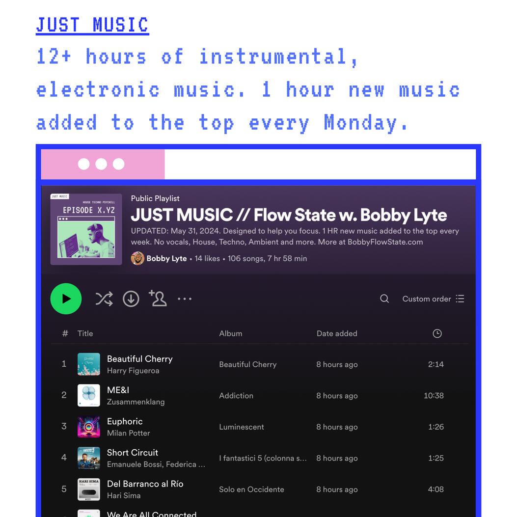 I've been powering through hours of work effortlessly with the Flow State podcast. The weekly episodes include 60 minutes of instrumental music that help me get through all types of work, even the tedious little tasks.